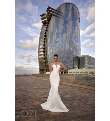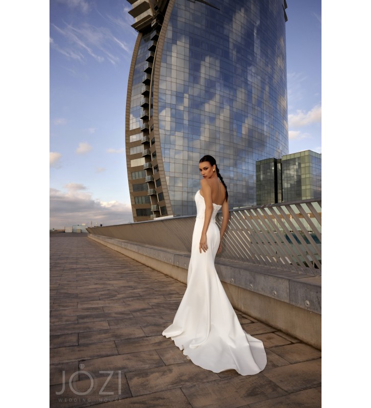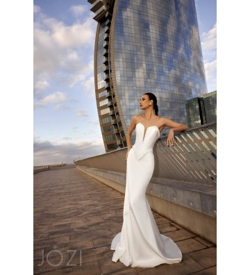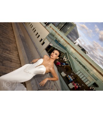 Θα ερωτευθείτε τη δαντέλα σε ένα νυφικό σε γραμμή A με διάφανη λαιμόκοψη Sabrina. Στολισμένη με βενετσιάνικη δαντέλα στη λαιμόκοψη και το μπούστο. Διαθέτει αφαιρούμενα μακριά μανίκια και διάφανη πλάτη. Το φόρεμα ολοκληρώνεται με τη φούστα από σιφόν και τη μακριά ουρά.